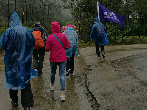 当日清晨6点多,长跑队队员们驱车两个多小时,奔赴至金寨县麻埠镇作为起点,开始向响洪甸水库终点奋进之旅。乡间步道,舒缓有致,国元长跑队高举国元旗帜,迎难而上,奋力前行,互相鼓励,相互扶持,一步步展示精神风貌,一步步丈量意志毅力。虽然雨中长行,汗流浃背,但沿途深山兰茗漫翠坡的茶园,涓涓流水绕房前的小溪,烟波浩淼碧万顷的湖面,尤其当来到“暂与人俗疏”的清幽小岛进行环岛行训练阶段时,深幽绝尘影婆娑的竹海,与淅淅沥沥的雨声合奏。这些移步换形的不同景色,都不断给队员们带来惊喜,大大减轻了马拉松式训练,长时间行进带来的劳苦疲惫。