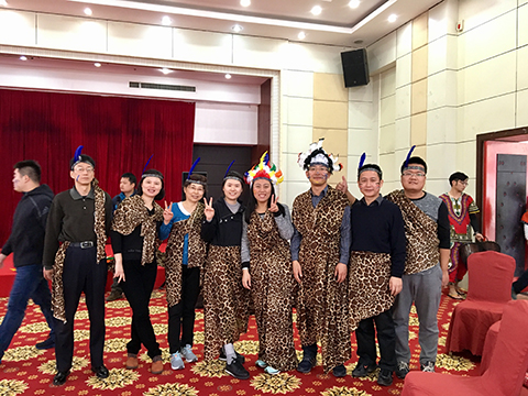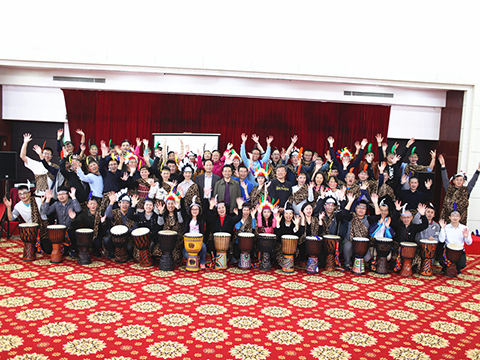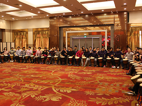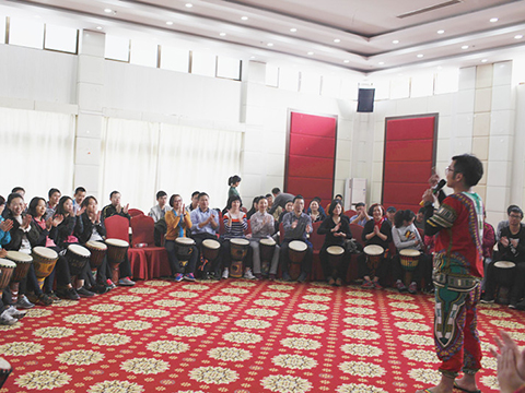 第二天的项目是非洲鼓,有一个非常押韵的主题《同心、同步、同鼓舞》。分配过角色之后,学员们穿上鲜艳的非洲民族服饰,在脸上画出神秘图腾,戴上五颜六色的羽毛头冠。在教练的带领下快速地融入游戏角色中,一起学习着非洲鼓,在激动人心的鼓声中进一步放松自己,提升自己。慷慨激昂的鼓声有助于打破人与人的隔阂,更加高效的协调工作,以顺利完成在工作中的合作目标。