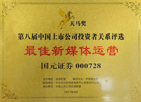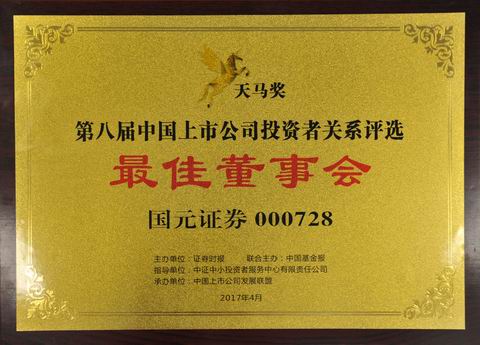 4月27日,由证券时报、中国基金报联合主办,中国上市公司发展联盟承办的“天马奖--第八届中国上市公司投资者关系评选”颁奖典礼在贵阳落下帷幕。国元证券凭借完善的公司治理、优秀的投资者关系管理水平及新媒体建设成果,荣获“中国上市公司最佳董事会”、“中国上市公司最佳新媒体运营奖”两项大奖。 作为国内最具权威的上市公司评选活动,“中国上市公司投资者关系评选”历届评选均由专业机构和行业专家组成评审团,以严谨的评估体系和评估方法,考察上市公司公司治理、信息披露、诚信合规、投资者关系管理和企业社会责任等各个方面。 2016年,公司坚持规范运作,坚持稳健发展,取得了良好的经营业绩,信息披露工作连续九年荣获深交所A类评级,被中证监会评为A类A级券商,反洗钱被人民银行评价A类;积极参与扶贫攻坚,着力构建产业扶贫、教育扶贫、生态扶贫与社会扶贫等“四位一体”的扶贫机制,助推安徽省内两个县级地区精准扶贫、精准脱贫,全年投入扶贫资金1500多万元。同时,积极利用互联网、网络电视、微信、APP等新媒体手段,加强与投资者的沟通与交流,大力宣传公司服务实体经济、企业文化、诚信合规、社会责任等方面取得的卓越成就,得到了社会各界和广大投资者的普遍认可,对传播公司品牌,提升市场形象起到重要作用。 公司荣获“中国上市公司投资者关系--最佳董事会”、“中国上市公司投资者关系--最佳新媒体运营奖”两项殊荣,既是鼓励,也是鞭策。2017年,公司将更加专注公司治理工作,同时认真做好投资者关系的维护,积极借助微信等新媒体进一步加强与广大社会公众投资者沟通和交流,切实维护投资者合法权益,为我国资本市场的繁荣添砖加瓦。