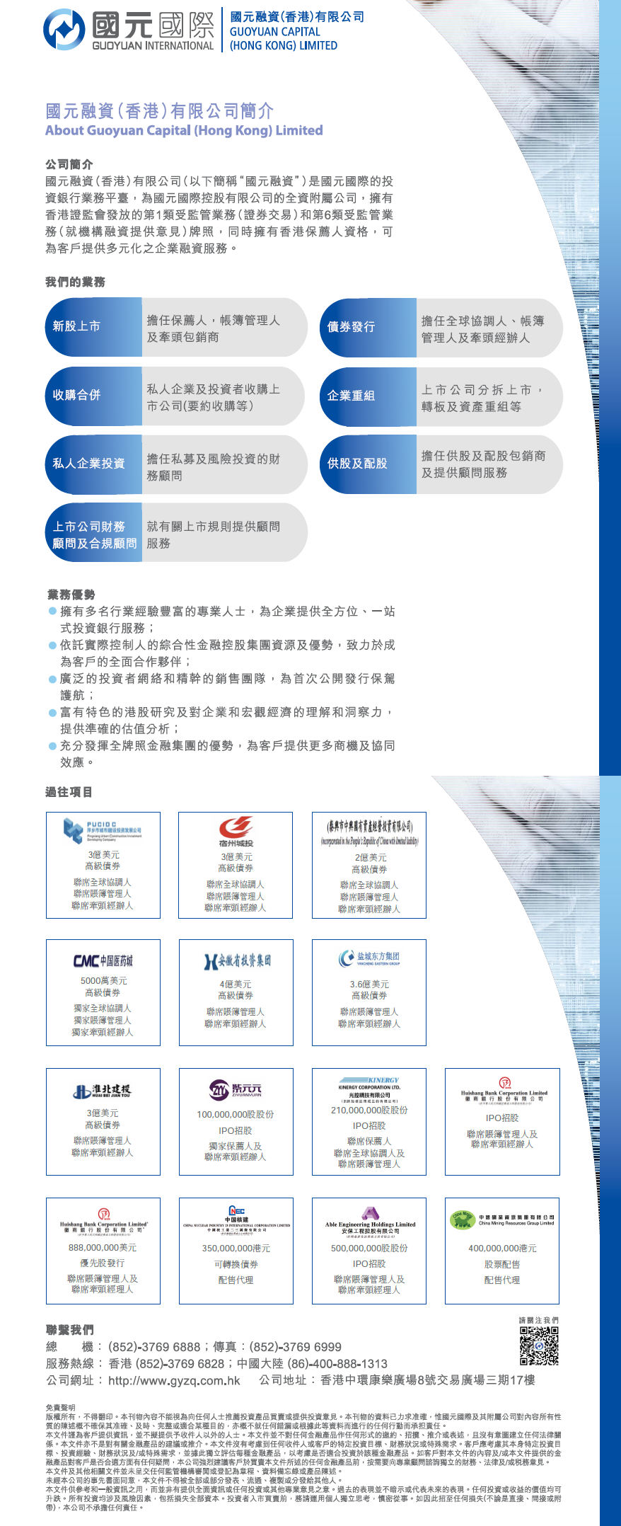经过3年的努力,国元国际在国企城投债、美元债的发行上,己在香港资本市场上树立了很好的品牌形象,取得了一定的行业地位。