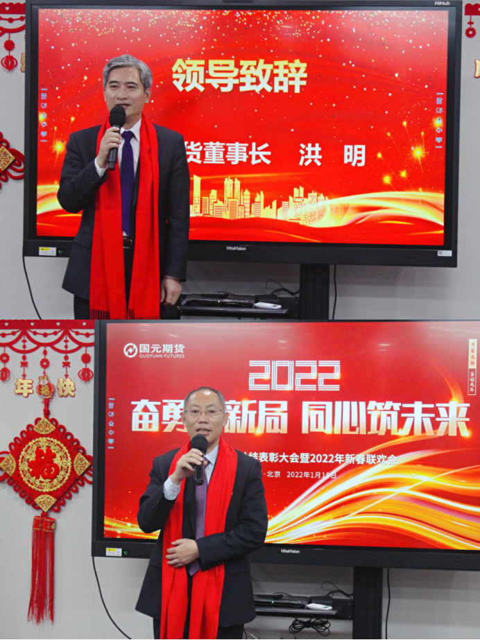 本次年会特邀国元证券股份有限公司党委副书记、总裁陈新以及台湾康和证券股份有限公司董事长郑大宇发表新年贺词,对国元期货2021年取得的佳绩表示肯定和祝贺,2022的发展寄予极大期许,并送出新春的祝福。