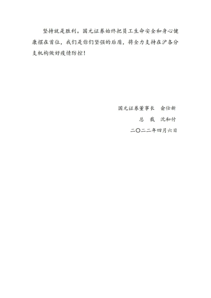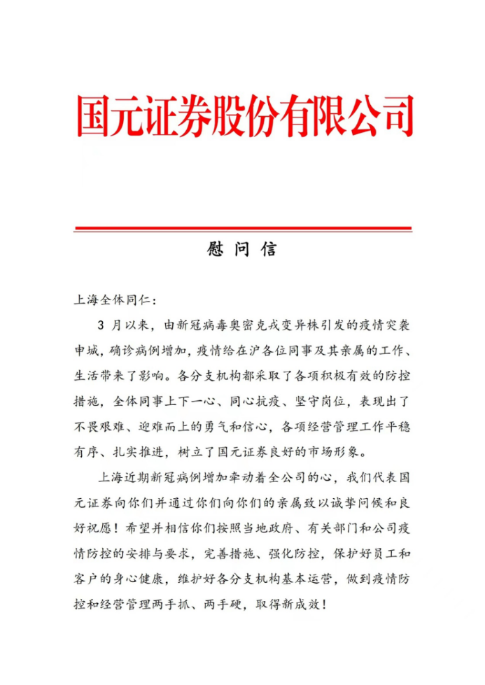 近期,上海新冠疫情确诊病例增加,牵动全公司心。俞董事长、沈总裁第一时间发来慰问信,对奋战在抗疫一线的在沪各分支机构全体同仁表示亲切慰问,并勉励大家保护好身心健康,维护好各分支机构基本运营,做到疫情防控和经营管理两手抓、两手硬,公司将全力支持在沪各分支机构做好疫情防控!
