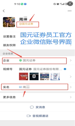 一、我公司严格要求所有营销人员统一使用企业微信与客户沟通,不会通过其他社交平台,尤其一些不知名的社交软件与客户联系提供投资服务。我公司官方企业微信账号为“员工姓名@国元证券”,见下图。