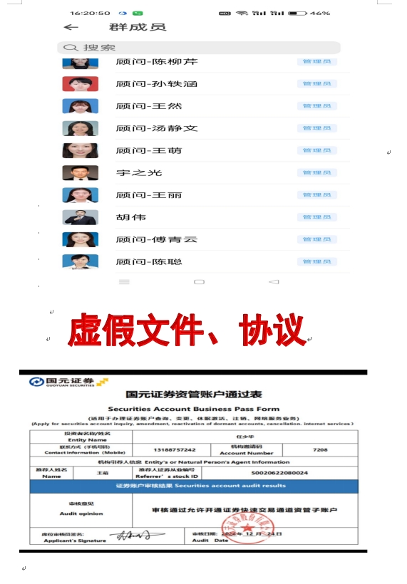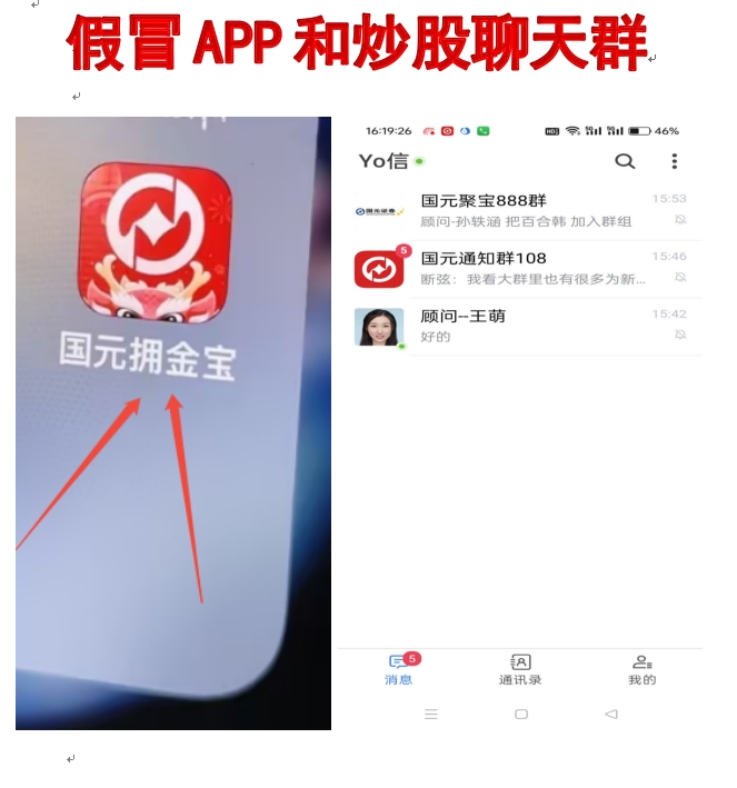 近日,国元证券股份有限公司(以下简称“我公司”)发现有不法分子通过“Yo信”社交APP,建立投资者炒股群“国元聚宝888”,群成员头像显示为假冒我公司的高管和员工,群内发送假冒高管签名的相关虚假协议,定时发送以“大宗交易”“操盘计划”“涨停板”为噱头的投资建议,引诱下载“国元拥金宝”假冒APP并转入资金,让投资者遭受巨额经济损失。该行为已严重影响到我公司声誉,侵犯了投资者的合法权益。