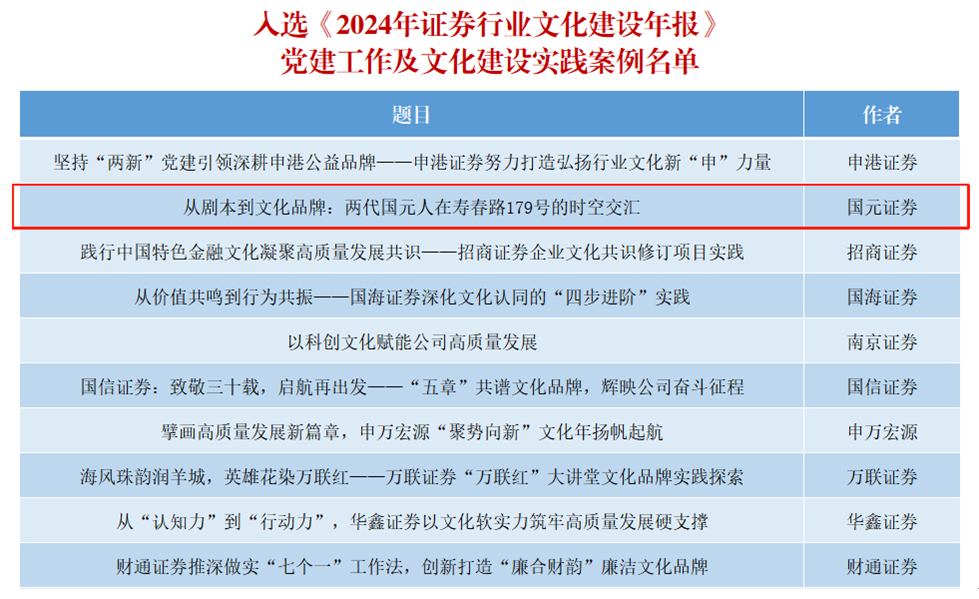 中国证券业协会日前披露了文化建设实践案例入选《2024年证券行业文化建设年报》的券商名单,国元证券再度榜上有名,连续4年入选证券行业文化建设年报。