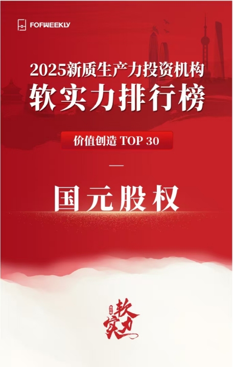 9月6日,由母基金周刊(FOFWEEKLY)主办的2025母基金年度论坛暨第六届鹭江创投论坛在厦门成功举办。大会以“中国力量”为核心主题,汇聚了全国社保基金理事会原副理事长陈文辉、中金资本董事长单俊葆、君联资本总裁李家庆等众多行业领军人物,围绕新质生产力投资、母基金进化、产业和资本协同等关键议题展开深度探讨,为中国股权投资行业的创新发展凝聚智慧。会上,母基金周刊重磅发布其年度投资机构排名榜单——2025新质生产力投资机构软实力排行榜,国元股权从众多参评机构中成功入围,荣获母基金周刊「2025新质生产力投资机构软实力排行榜-价值创造TOP30」奖项,充分体现了基金投资行业和资本市场对国元证券近年来加强股权投资工作、深化布局新质生产力投资方向和战略的高度认可和肯定。
