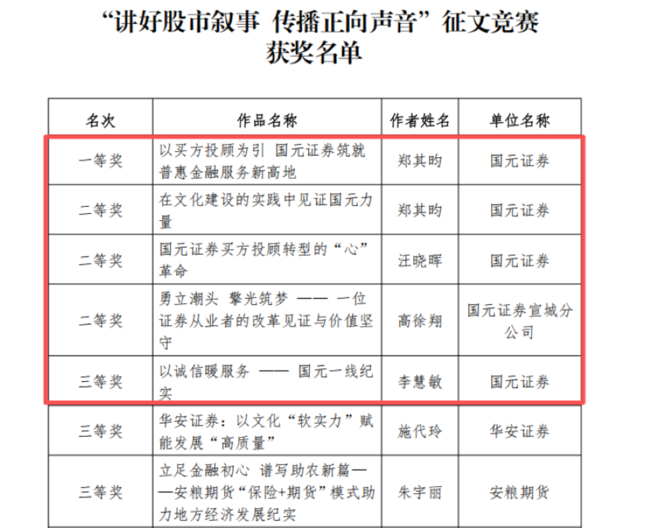 近日,由安徽证监局指导,安徽省证券期货业协会主办的“讲好股市叙事 传播正向声音”征文竞赛落下帷幕。国元证券凭借深厚的行业积淀与优质创作,在此次竞赛中表现亮眼,斩获多个奖项,其中一等奖1篇、二等奖3篇、三等奖1篇。